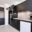 Une cuisine équipée : lave-vaisselle, cafetière filtre, four, plaques, réfrigérateur