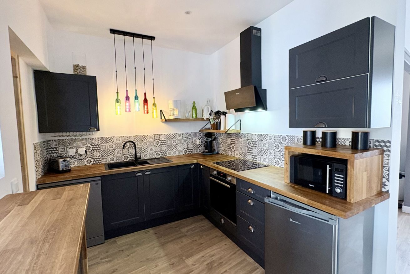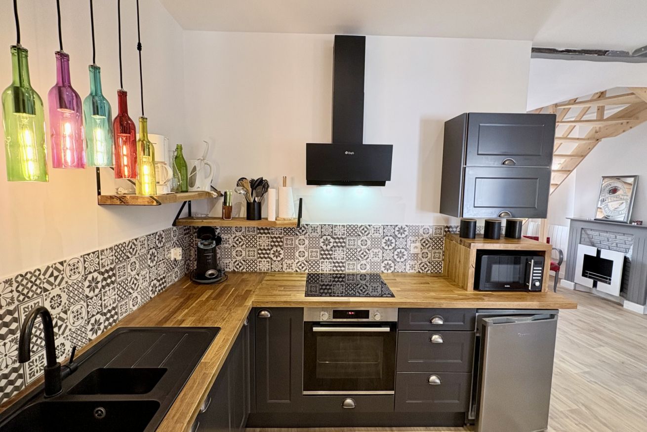 La maison se compose d’une belle pièce de vie conviviale avec salon et salle à manger, ainsi qu’une cuisine entièrement équipée (lave-vaisselle, cafetière Senseo + filtre…).