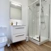 La salle de bain est équipée d'une douche spacieuse, de toilettes et d'un lavabo à une vasque, offrant tout le confort nécessaire pour votre séjour.