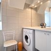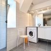 La salle de bain spacieuse comprend une baignoire, une paroi de douche et une machine à laver, tandis que les toilettes sont séparées pour plus de commodité.